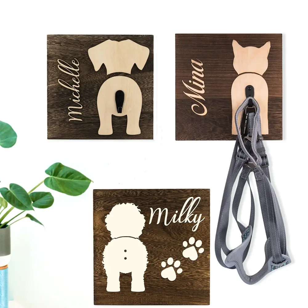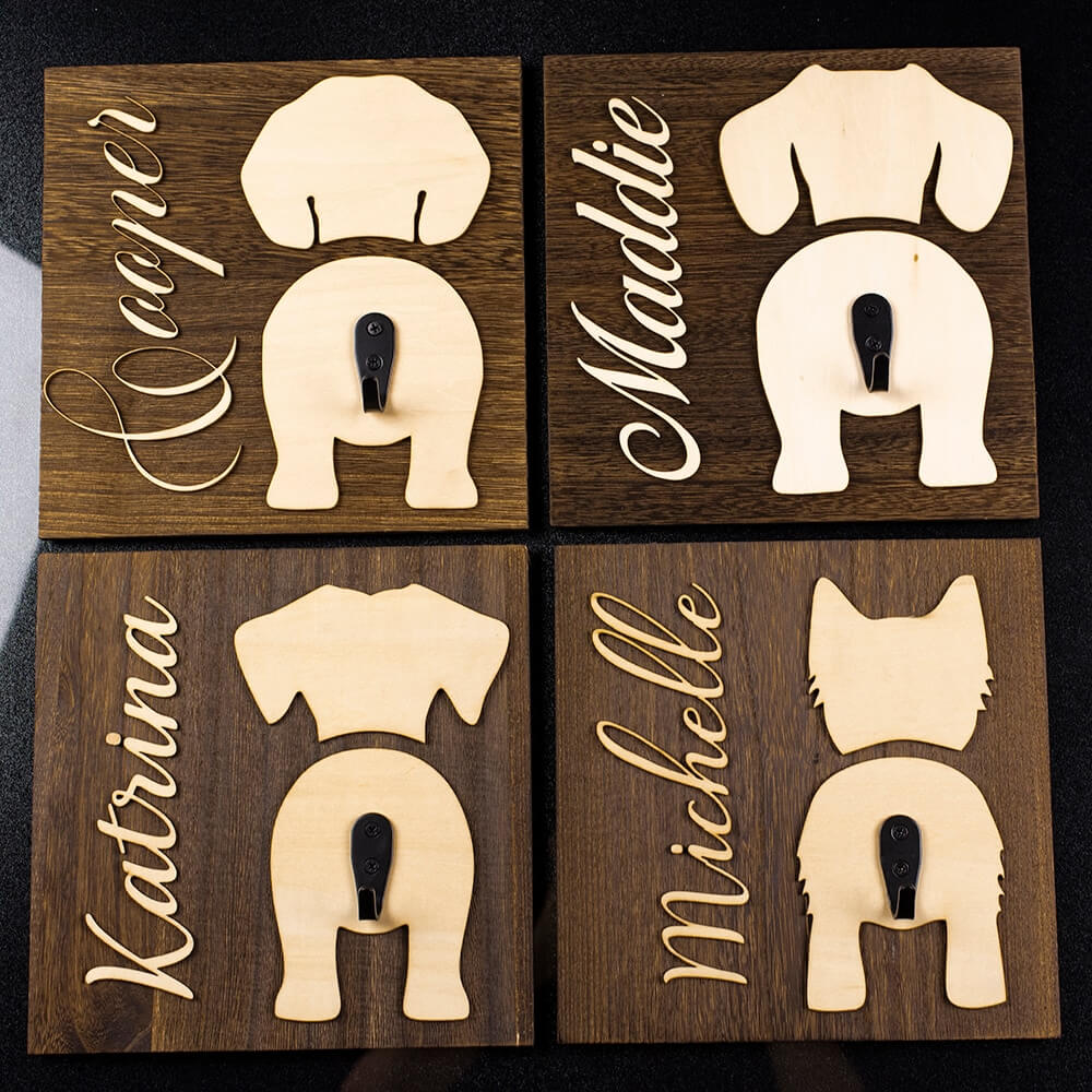 Assembling and installing new personalized holders is extremely simple. Your package will consist of a wooden board engraved with your pet’s name and application, as well as 2 double screw pads, 10 screws in total, a hook for hanging the board and a decorative tail that also serves as a hook for hanging the equipment.